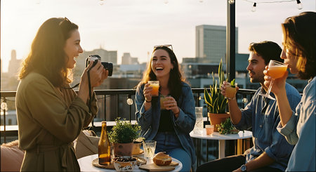 Group of four friends socializing on a rooftop patio, enjoying drinks and food while taking in the city view at sunset, with a photographer capturing the moment.