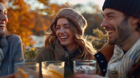 A group of friends laughing and enjoying glasses of mocktails with a scenic autumn backdrop