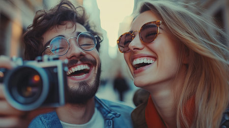 Joyful couple taking selfies outdoors capturing moments of happiness