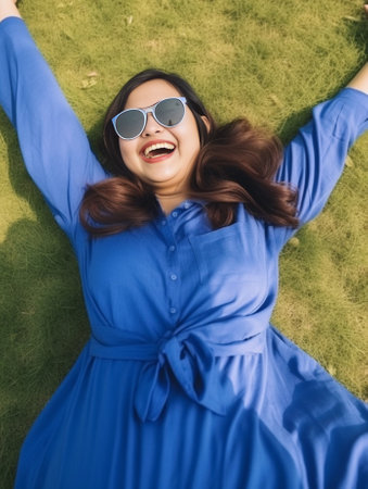 Generative AI : Young happy girl taking a selfie lying on the grass
