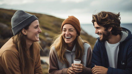 A diverse group of friends laughing and bonding together in a natural,outdoor setting,showcasing the importance of social connections,mental wellness,and the pure joy of shared experiences.