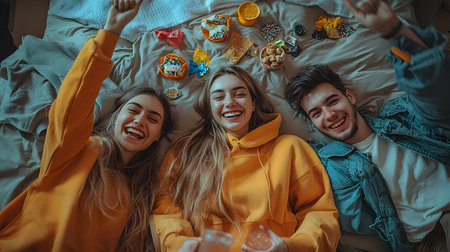A Joyful Hangout of Friends Sharing Laughter and Snacks on a Cozy Bed