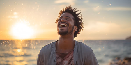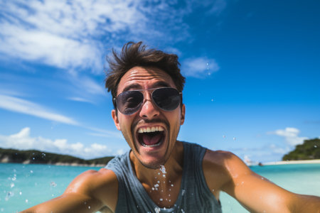 a man raises his hands in the air as water splashes over him, creating a snow-like effect. this captivating social media portrait captures the essence of ocean academia. the photo, taken with fujifilm superia, showcases the strong facial expression of the subject, portrayed by even mehl amundsen. tooth wu. ai generated