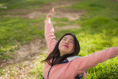 lifestyle portrait of young happy and beautiful Asian Korean woman in pink sweater lying on green grass cheerful and excited playing outdoors enjoying carefree