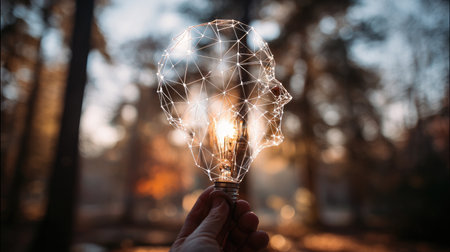 A lightbulb shaped like a human head is held up against a blurred natural backdrop, featuring trees and sunlight. The image showcases a network of interconnected lines within the bulb, suggesting ideas and innovation. This composition utilizes a shallow depth of field, with soft focus and warm tones for potential use in editorial or commercial concepts.
