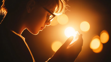 Child explores warm light while holding a small source of illumination in a cozy atmosphere during evening hours
