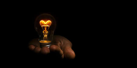 incandescent heart shaped light bulb in hand on black background for valentine's day