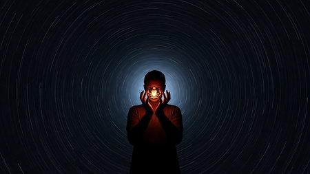 Silhouette of man facing hypnotic circular light patterns in darkness.