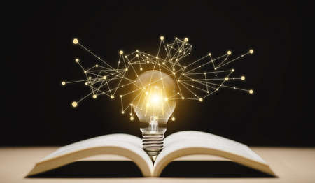 Thinking and creative concept, Light bulb on the Book and light bulb style bokeh vintage dark background,Concept The idea of reading books, knowledge, and searching for new ideas.
