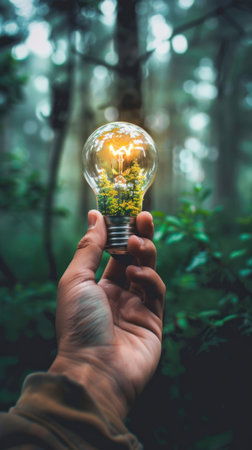 Hands holding glowing bulbs with plants, symbolizing innovation and sustainability in a vibrant atmosphere.