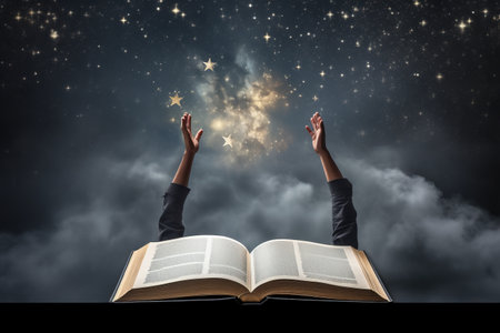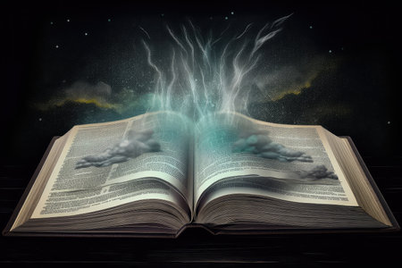 magical book, with page turned to reveal illustration of stormy night sky, created with generative ai