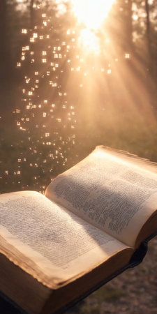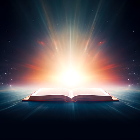 An open Bible radiates light against a backdrop of dramatic clouds, symbolizing spirituality and divine inspiration. The scene evokes a sense of peace and hope.