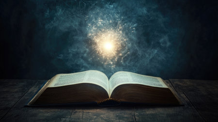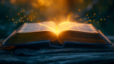 Open book with magical, glowing light on a wooden surface. A sense of mystery and magic as if the book contains powerful knowledge or is enchanted.