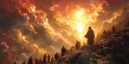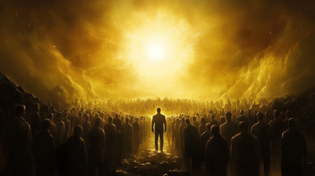 Crowds of figures await a radiant figure in a golden landscape under a brilliant light, symbolizing hope and unity