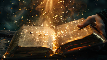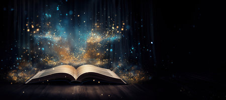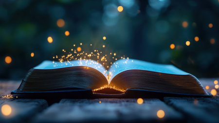 Open book with shimmering lights pouring from its pages in darkness
