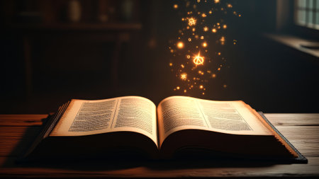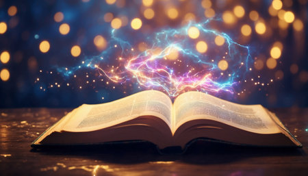 Mystical book with glowing text reveals ancient knowledge and wisdom