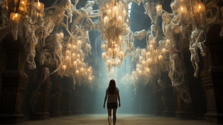 A radiant woman glides into a room, her steps guided by the shimmering light of a grand chandelier, casting an ethereal glow upon her elegant figure