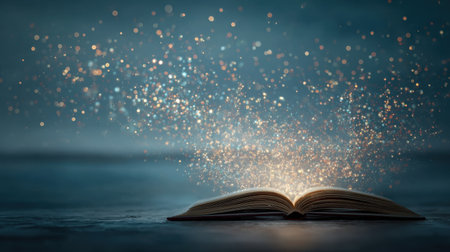 An enchanting open book emits glowing particles in a dark foggy setting, symbolizing the magic of storytelling, knowledge, and the beauty of literature.