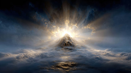 A breathtaking view of a mountain peak emerging from thick clouds, illuminated by radiant sunlight. This atmospheric scene captures nature's beauty and majesty.