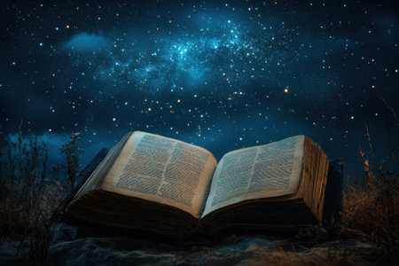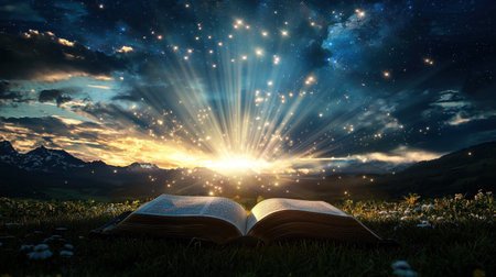 An open book lies in a field, illuminated by the light of a starry sky, inviting exploration of its pages.