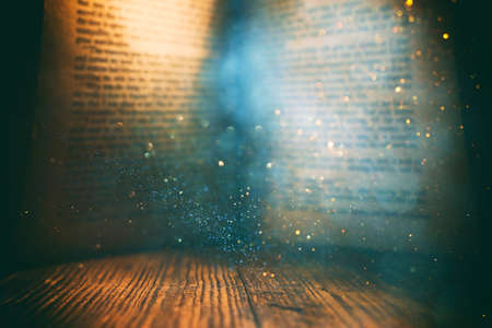image of open antique book on wooden table with glitter overlay