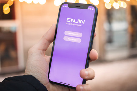 Kharkov, Ukraine - May 27, 2021: Man use mobile phone with Enjin NFT crypto blockchain wallet app, banner