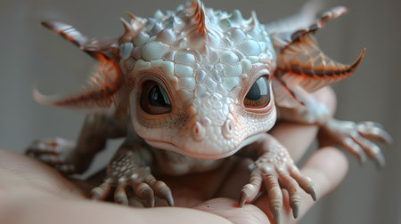 Baby dragon on hand, detailed scales, large expressive eyes, soft indoor lighting, closeup