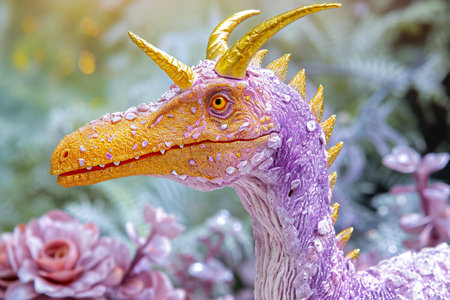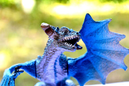 Colorful fantasy dragon statue with bokeh background, close up