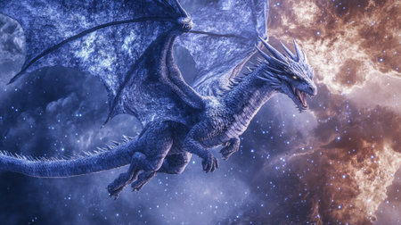A stunning illustration of a majestic blue dragon soaring through a celestial background, embodying cosmic energy and the mystery of mythical legends.