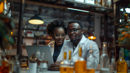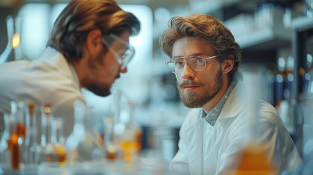 Bright minds at work Two cheerful young scientists making experiments and looking at each other while sitting in the laboratory : Generative AI