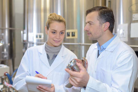 Specialist working team checking product drink bottle contaminate cleaning quality in factory. teamwork high standard people in food industry concept.