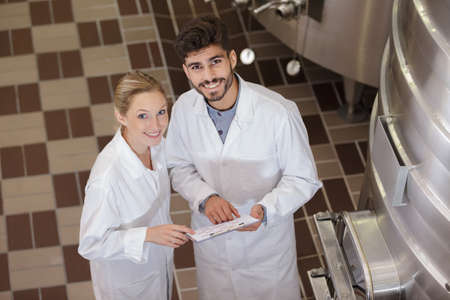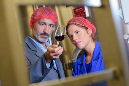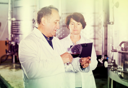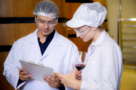 Winemaker team checking and examining producing wine at winery in factory, inspector checking quality and fermenting wine storage in tank or barrel at room, industrial and manufacture concept.