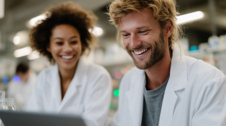 Happy female and male engineers working together on a laptop in a laboratory. Focus on teamwork and technology.
