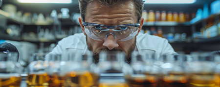 Scientist test tubes with liquid equipment science experiments and wears protective goggles