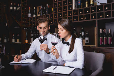 Friends tasting red wine sommeliers and taking notes at degustation notepad