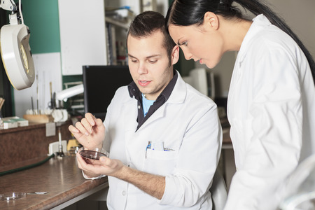Doctors in the laboratory analyze samples under a microscope. Pharmaceutical treatment concept