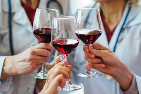 A group of medical professionals raises their glasses filled with red wine, celebrating a recent achievement together in a cheerful and collaborative atmosphere.