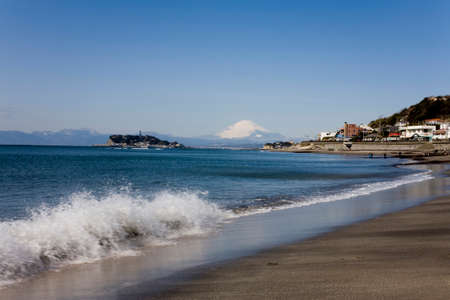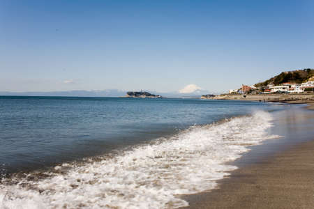 Beach and waves, Mt Fuji and Enoshima Island.