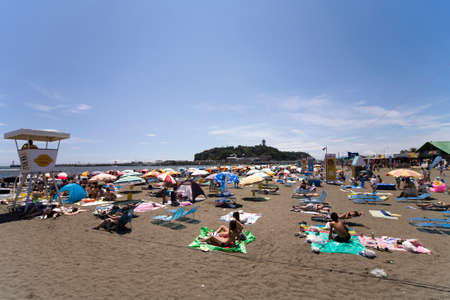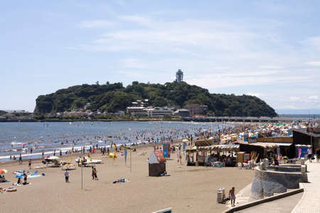 Enoshima, Japan - June 09, 2017: View of Enoshima island with sea in Kanagawa, Japan. Enoshima is a pleasantly touristy island just off coast but connected by bridge with the mainland.