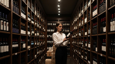 A panoramic, cinematic image capturing a woman making a considered selection of a fine red wine with