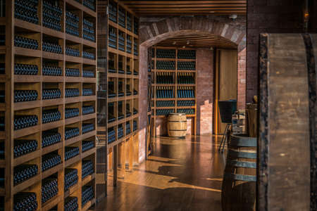 Many wine bottles on wine shelves. Resting on wooden racks in cellar. Interior in the restaurant.