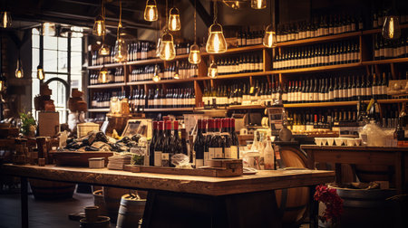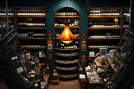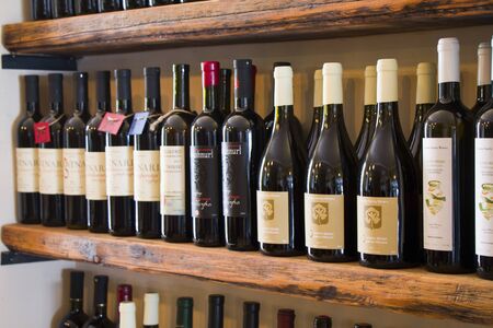 Wine bottles on the shelf, wine shop interior, winery in Tbilisi, Georgia