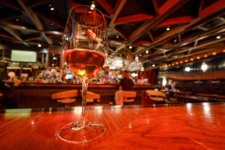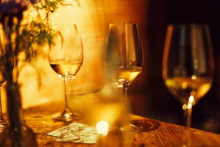 wine glasses and bottles of wine in the entourage of the wine bar in the evening