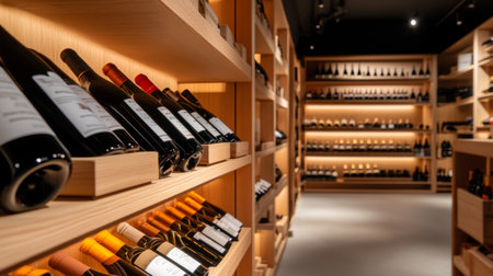 Wine collection displayed in a modern cellar with wooden shelves and warm lighting
