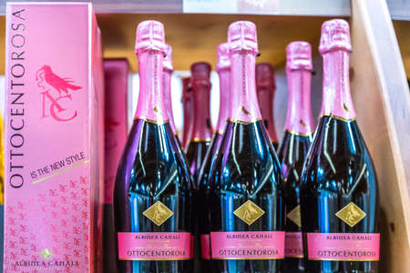 KIEV, UKRAINE - JUNE 04, 2016: Rose wine from different manufacturers closeup presented on the store shelves at Kyiv Wine Festival organized by Good Wine company in Parkovy Exhibition Center.