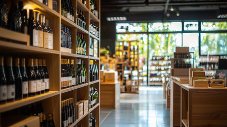An inviting wine shop interior featuring rows of wine bottles on wooden shelves, illuminated by natural light from large windows. A perfect setting for shopping.