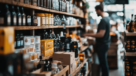 A man browsing through an organic food store aisle filled with various jars, bottles, and packages on wooden shelves. The blurred background and warm lighting create a cozy shopping atmosphere.
