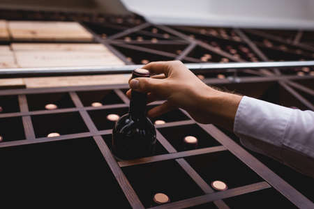 Cropped view of sommelier taking bottle of wine from wooden rack