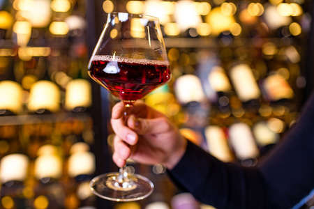 hand holding a glass of red wine selective focus view, tasting room wines bottles display on wooden racks shelves background, wine shop interior