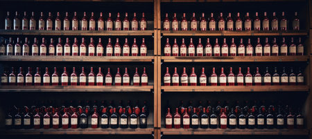 Berlin, Germany – January 29, 2018. Rows of wine bottles on wooden shelves.